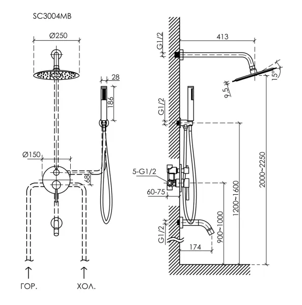 Душевой комплект SANCOS Select встраиваемый для ванны/душа, с внутренней частью, верхним, ручным душем, изливом и шлангом в комплекте, цвет черный матовый, арт.SC3004MB