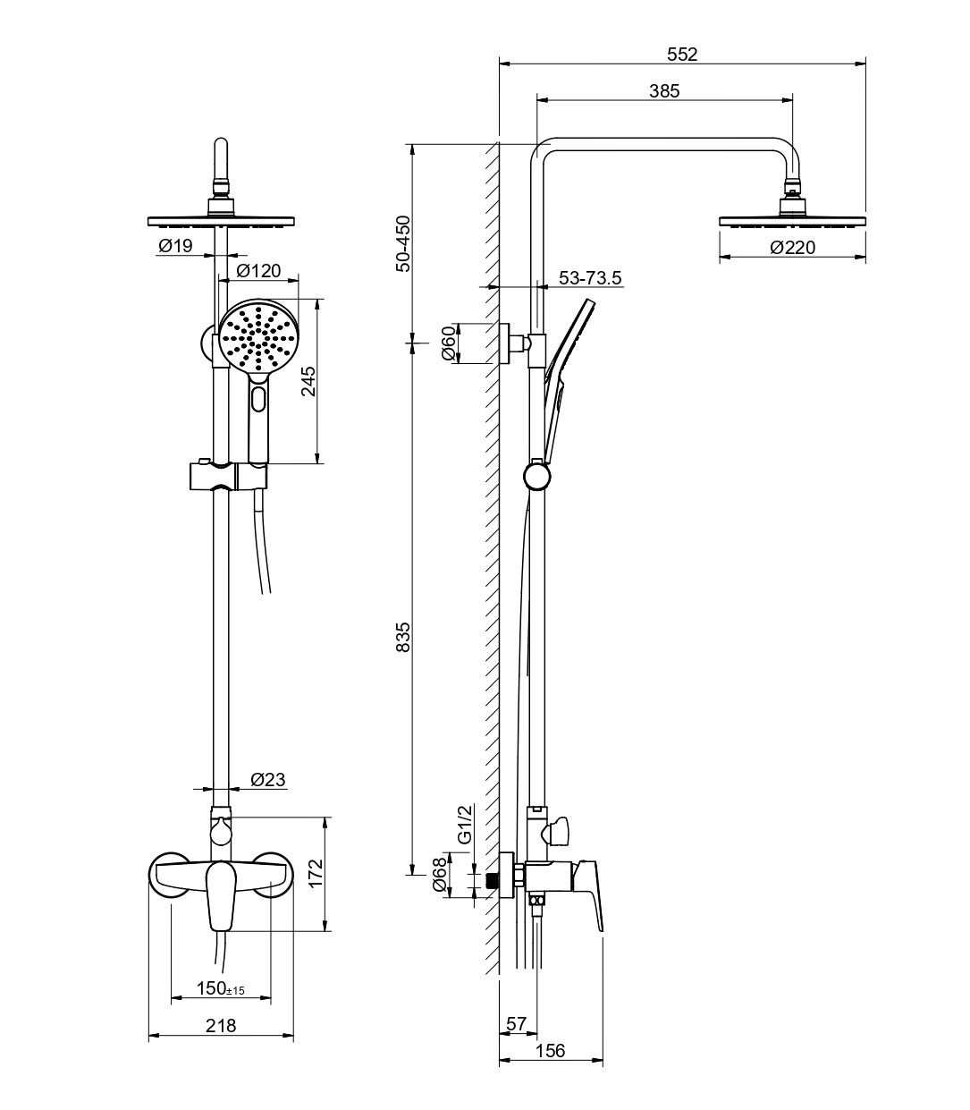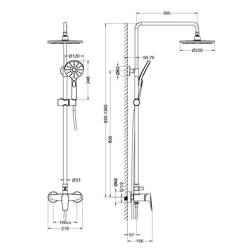 • регулируемая душевая штанга из нержавеющей стали, выдвигающаяся до 1365 мм в высоту