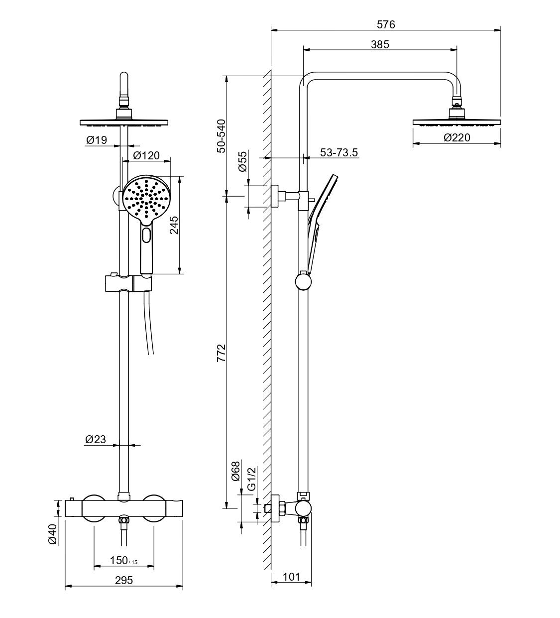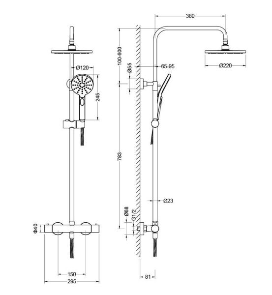 • регулируемая душевая штанга из нержавеющей стали, выдвигающаяся до 1383 мм в высоту