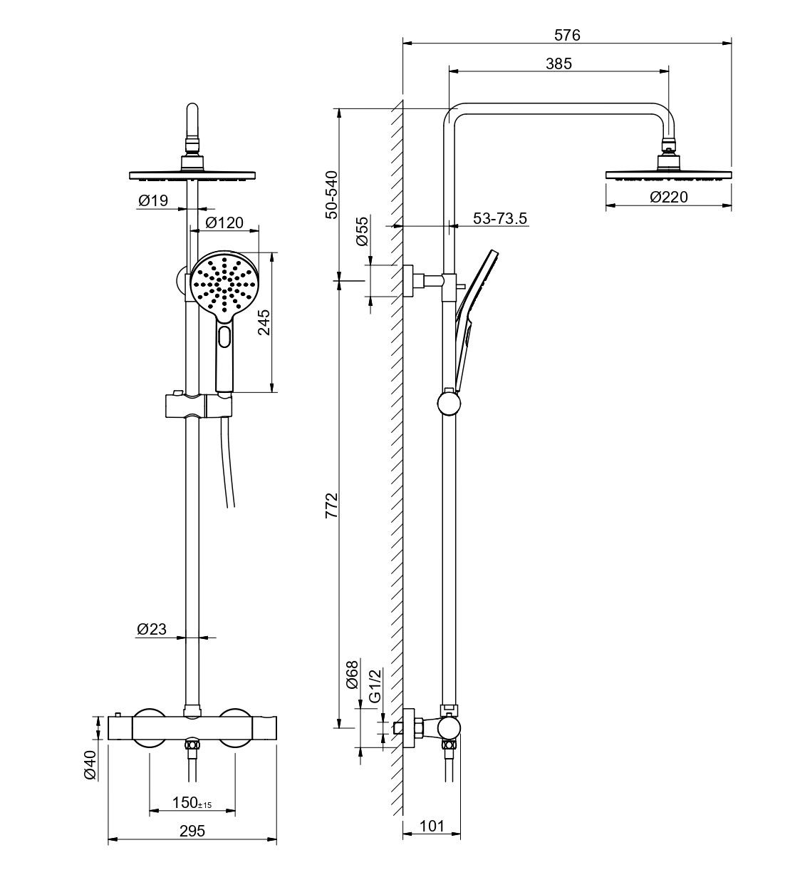 • регулируемая душевая штанга из нержавеющей стали, выдвигающаяся до 1383 мм в высоту