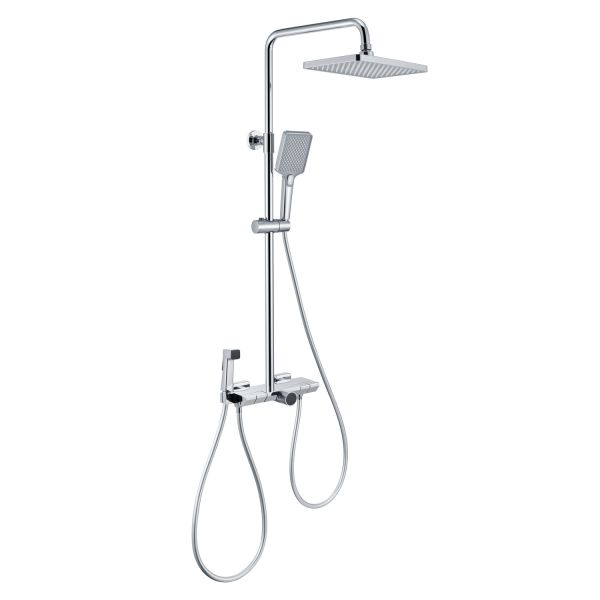 Из потребителей на системе установлен ручной режимный и верхний душ, а также излив скрытой установки и гигиенический душ. Выбор потока осуществляется через клавиши расположенные сверху корпуса смесителя.