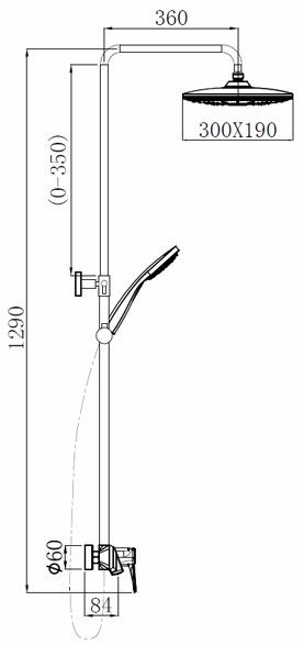 - прямоугольная лейка верхнего душа 390х190 мм, на шаровом шарнире, угол наклона 15 градусов