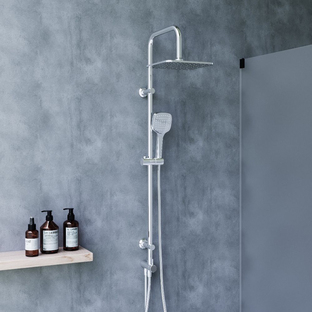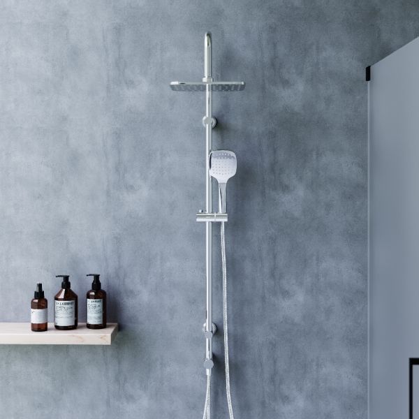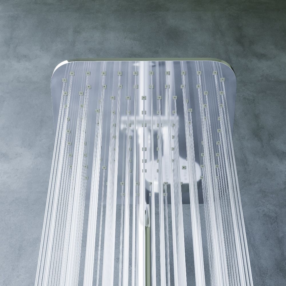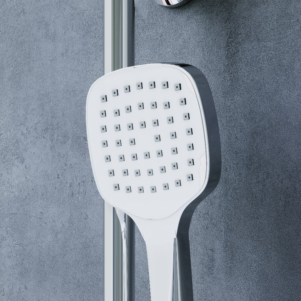 Стильные и большие квадратные лейки обеспечат комфортный напор воды, а слайдер ручного душа и крепление верхнего позволит настроить нужное положение.