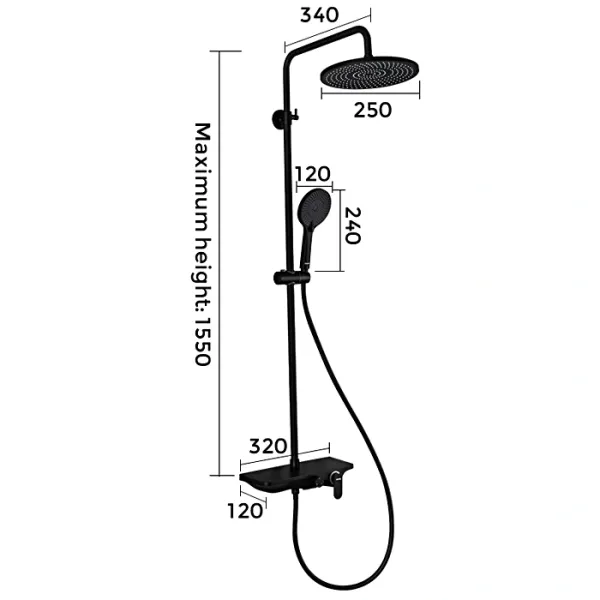 Душевая стойка Gappo G2495-5 изготовлена из латуни, цвет - черный матовый. Состоит из верхнего тропического душа, однорычажного смесителя со скрытым изливом, ручной лейки (3 режима) с держателем и душевым шлангом (150 см). Душевая стойка легко очищается от известкового налета.