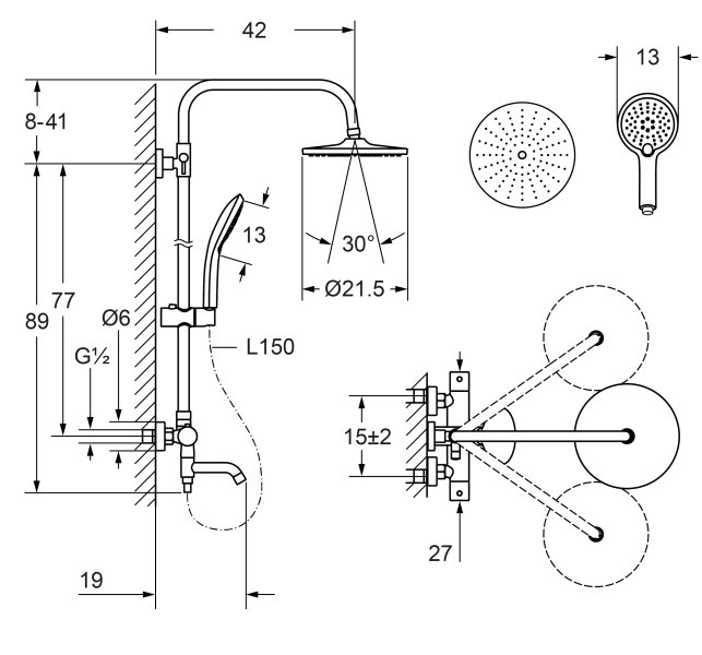 Горизонтальный душевой кронштейн, смеситель термостатический,