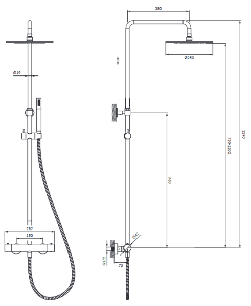 • верхний душ латунный, размер: ø25 см, отдаленность от стены: 35 см