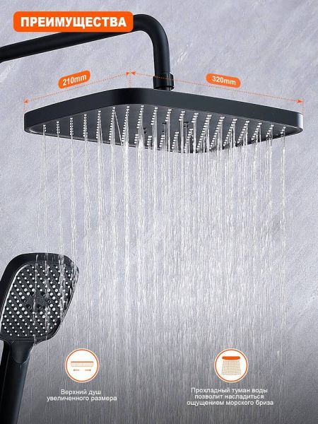 Верхний душ 320х210 мм регулируется по высоте благодаря телескопической штанге и по наклону с помощью встроенного шарнира, что обеспечивает максимальный комфорт и удобство использования. Самоочищающиеся силиконовые форсунки предотвращают образование известкового налета и сохраняют чистоту и силу потока воды.