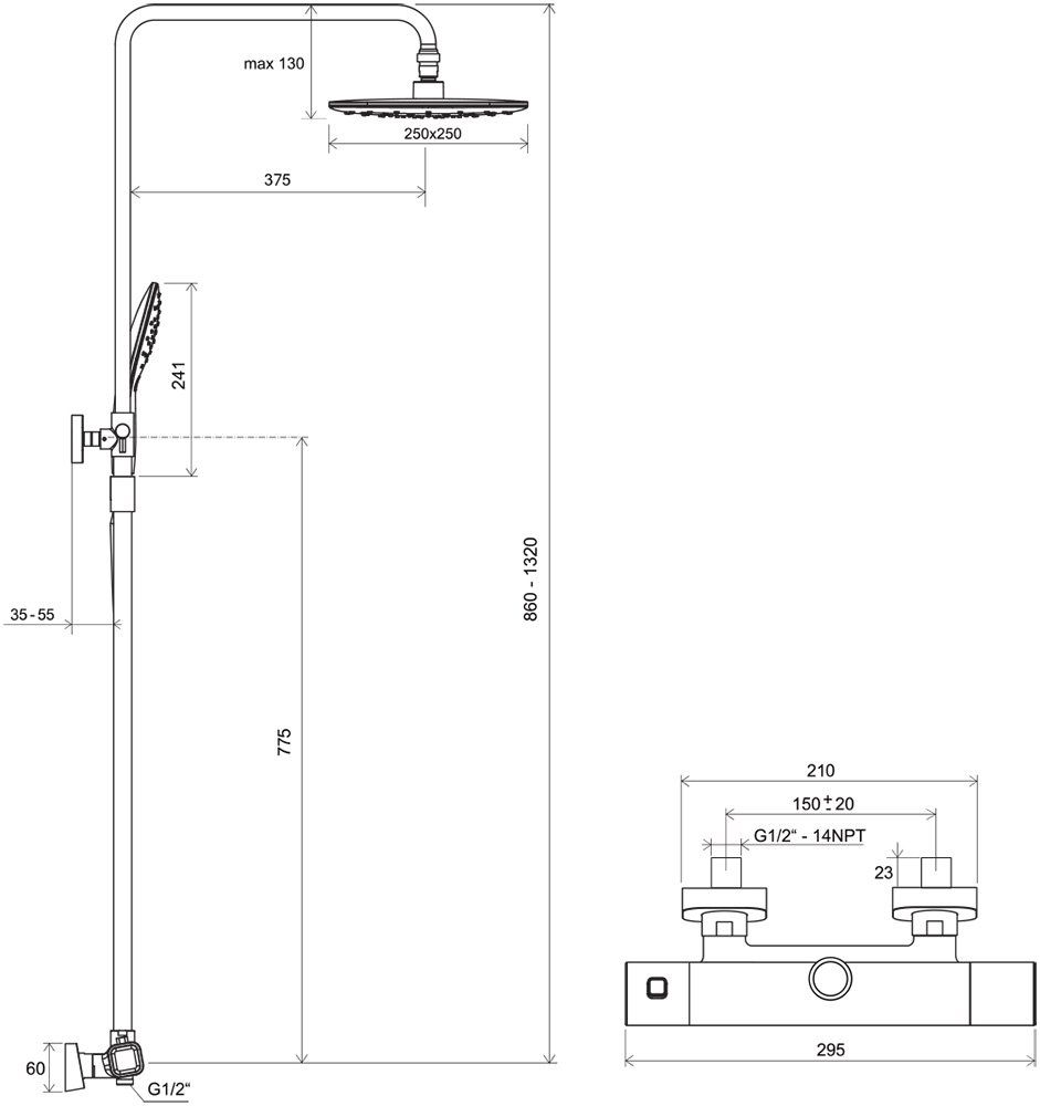 • Высота душевой стойки: регулировка в диапазоне 86-132 см