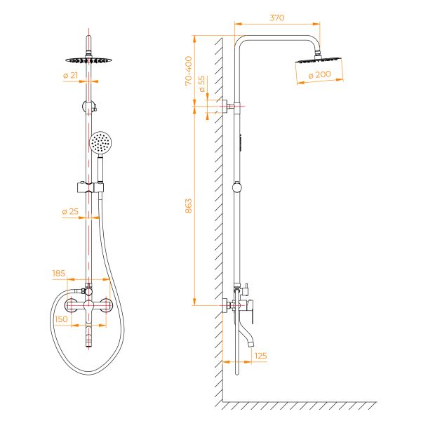 • Стальная штанга с регулировкой высоты головного душа