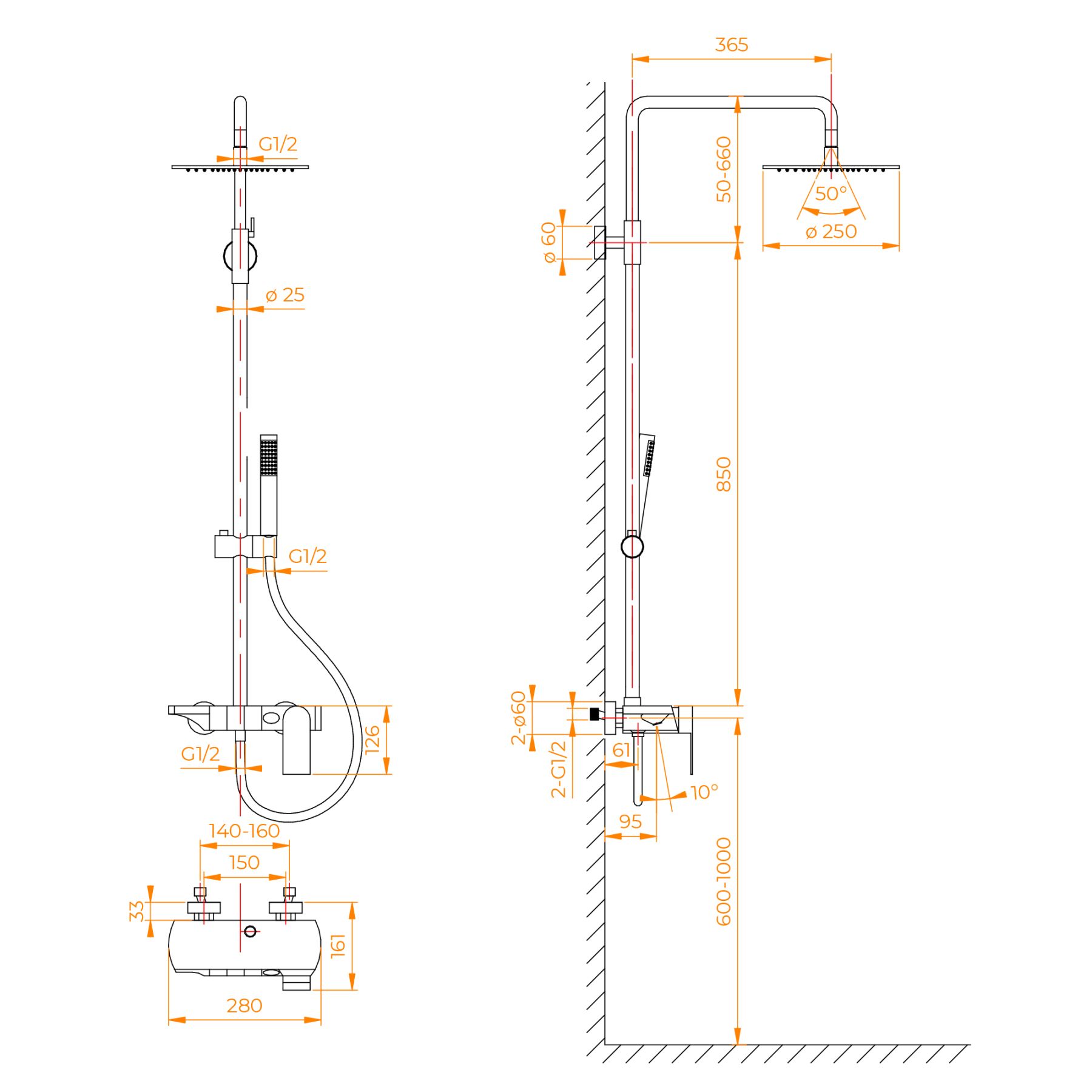 • Стальная штанга с регулировкой высоты головного душа