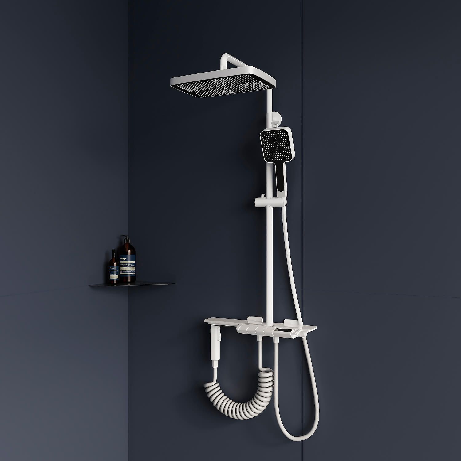 • Вместительная стеклянная полка для душевых принадлежностей;