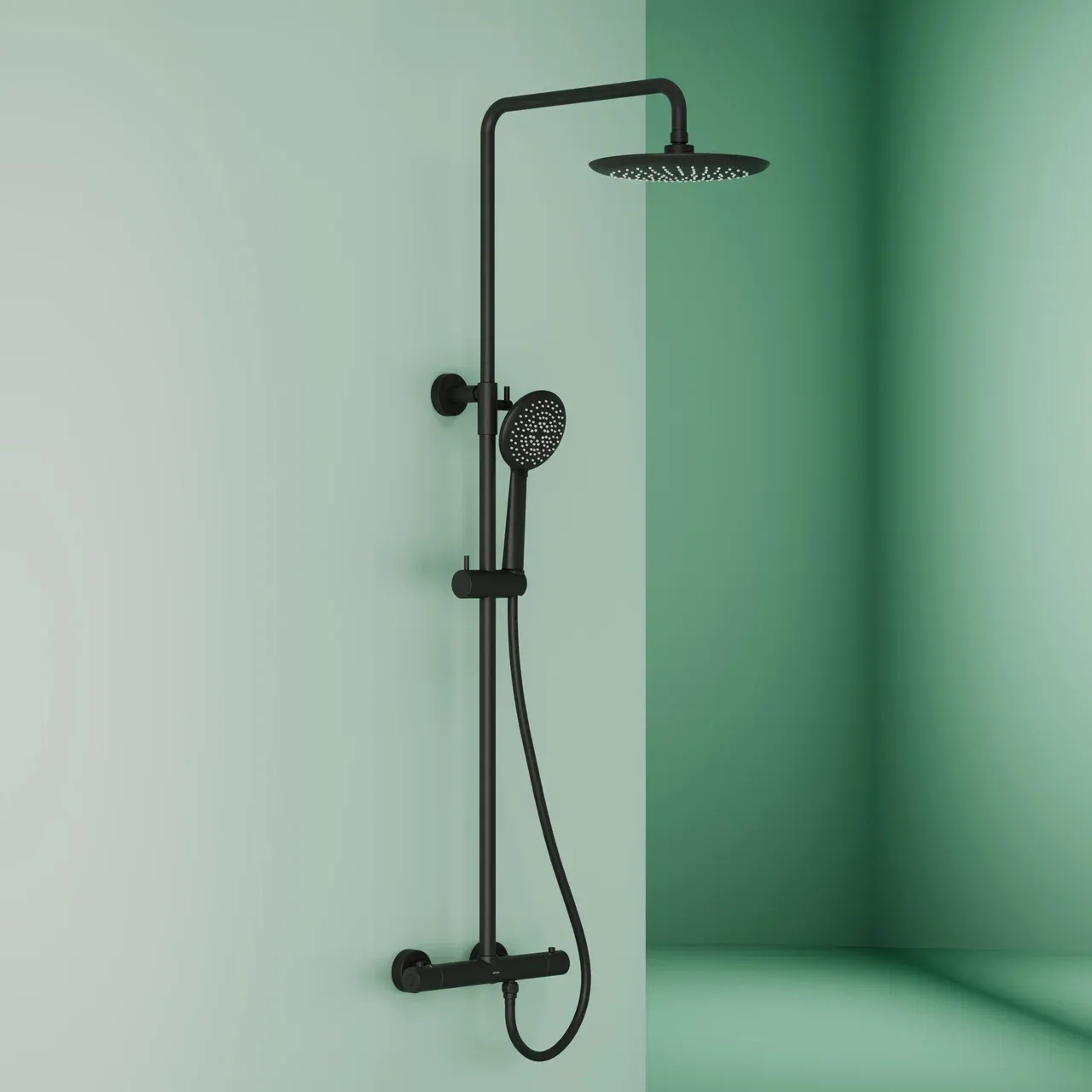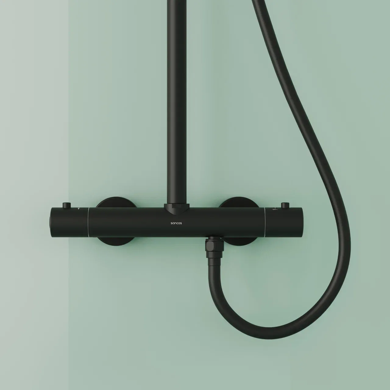 Душевая стойка SANCOS Game для душа с термостатическим смесителем, верхним, ручным душем и шлангом в комплекте, цвет черный матовый, арт. SC3002MB