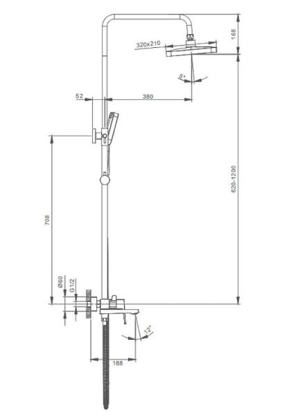 Душевая система Splenka S01.24.03. Цвет: сатин золотой. Материал: латунь. Управление: однорычажное. Механизм: керамический картридж. Излив: поворотный. Аэратор. Стандарт подводки: G 1/2. Форма верхнего душа: прямоугольная. Размер верхнего душа (ШхД): 320х210 мм. Количество режимов струи ручного душа: 3. Регулируемая душевая штанга: 620-1200 мм. Монтаж: на стену.