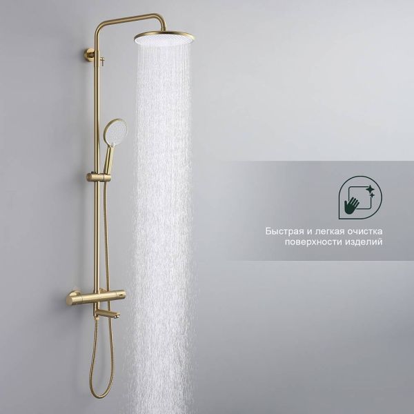 Душевая система с термостатом Splenka S223.26.03, сатин золотой. Душевая система термостатическая подходит для ванны и душа. Излив у системы поворотный. Излив - функция переключения режима. Верхний душ имеет круглую форму. Верхний душ - ∅250мм. Ручная лейка у системы 3-х режимная. Лейки изготовлены из авс-пластика.