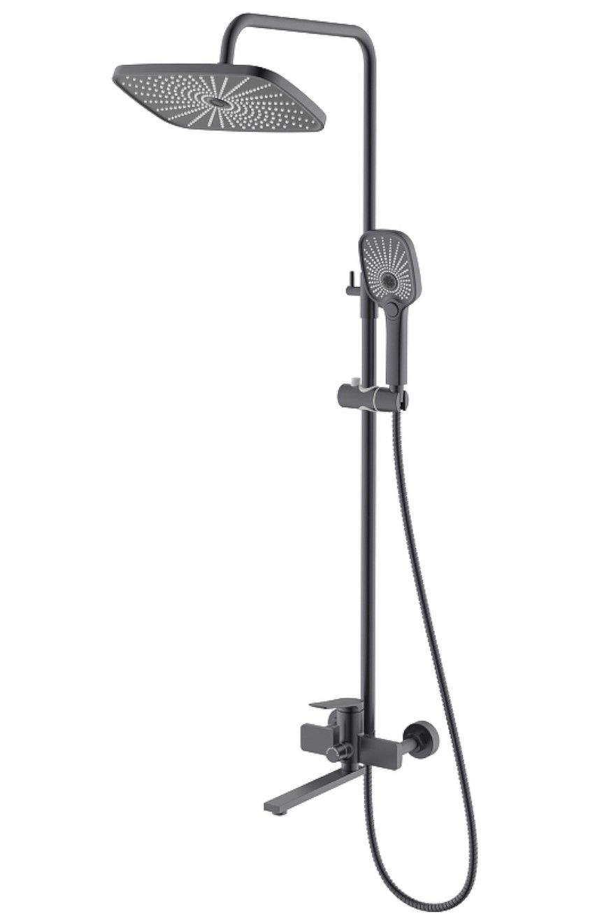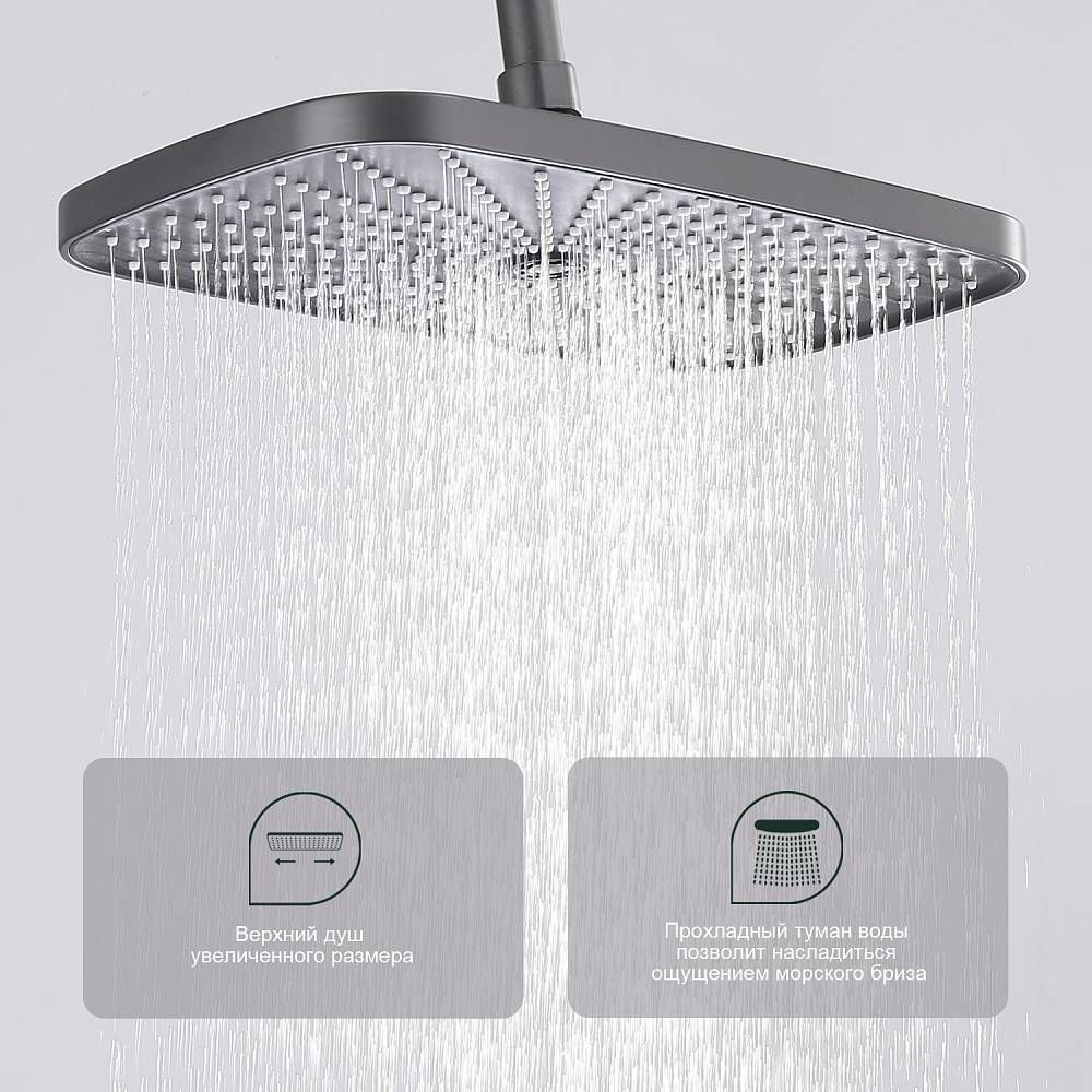 Душевая система Splenka S40.24.07. Цвет: серый. Материал: латунь. Управление: однорычажное. Механизм: керамический картридж. Излив: поворотный. Аэратор. Стандарт подводки: G 1/2. Форма верхнего душа: прямоугольная. Размер верхнего душа (ШхД): 300х190 мм. Количество режимов струи ручного душа: 3. Переключение режимов ручного душа: кнопочное. Регулируемая по высоте душевая штанга: 950-1350 мм. Регулируемый по высоте держатель ручного душа. Монтаж: на стену.