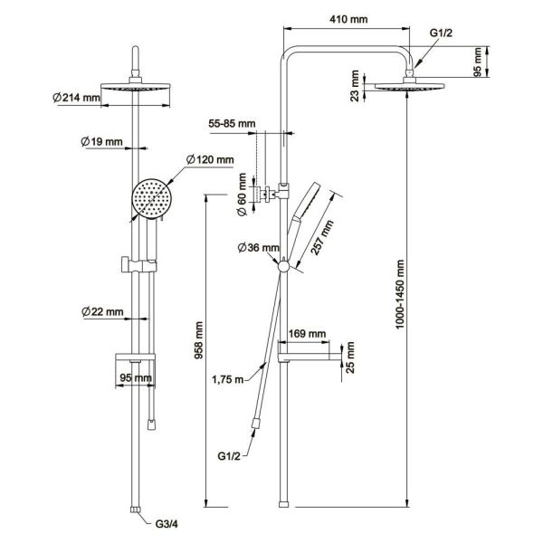 Семейный душ с верхним подключением и со смесителем для ванны с поворотнрым изливом, верхний душ:диаметр 214 мм,лейка: диаметр 120 мм, 3 режима.Шланг PVC: 1,75 м.Цвет: черный.