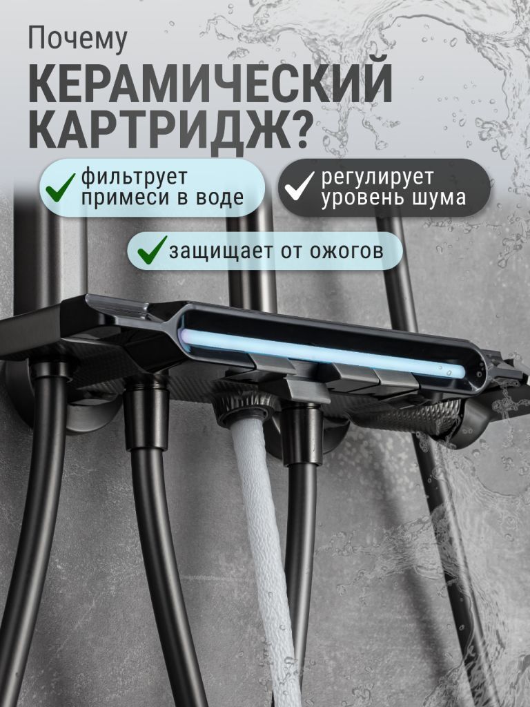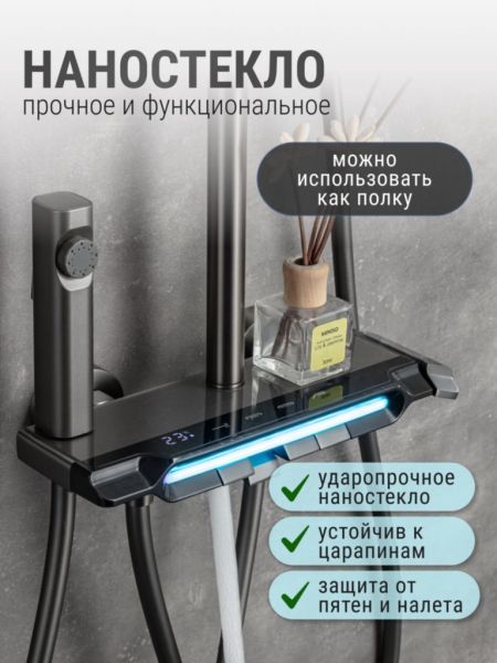 Душевой комплект содержит все необходимое для монтажа. Кроме того, наша душевая стойка с дисплеем и подсветкой имеет простой и быстрый монтаж, благодаря чему вы сможете установить ее самостоятельно без привлечения специалистов. Это позволит сэкономить время и деньги, а также получить удовольствие от процесса создания своего уютного уголка в ванной комнате.