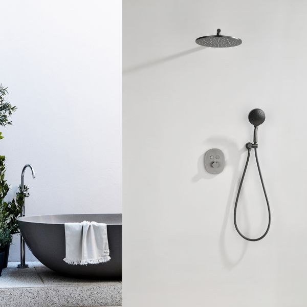 Комплект встраиваемого смесителя для душа датского производителя Black&White в цвете оружейная сталь. Корпус блока управления и смесителя выполнен в форме овала, для подачи воды и настройки температуры используется термостатический смеситель без регулировки давления. А для выбора нужного режима установлены две круглые кнопки с пиктограммами . Из потребителей доступен ручной душ с переключателями режимов и верхняя лейка на круглом кронштейне. Плавные формы корпуса смесителя и круглые лейки гармонично выпишутся в классические и минималистичные интерьеры.