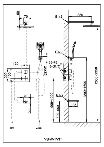 квадратныйРазмер верхнего душа, мм:
