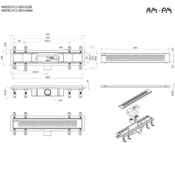 Душевой лоток AM.PM PrimeFlow 50 W02SC-P11-050-01SB с решеткой Хром матовый Cut Gradient Подробнее