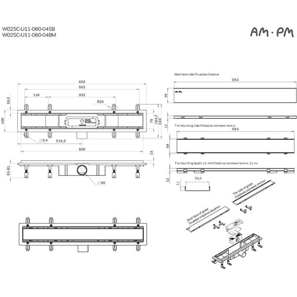Душевой лоток AM.PM PrimeFlow 60 W02SC-U11-060-04BM с Черной матовой решеткой / под плитку Tile Подробнее