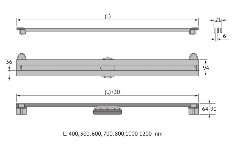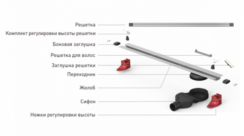 Решетка и декоративные заглушки, нержавеющая сталь AISI 304Комплект регулировки решетки по высоте от 8 до 25 ммСетка для волос, пластикКомплект гидроизоляцииЖелоб водосток, нержавеющая сталь AISI 304Монтажная заглушка, пенопластРегулируемые по высоте ножки, пластикСамопромывной S-образный сифон PP:Вертикальный выпуск пропускная способность 42 л/мин, монтаж 360°Монтажный ключ, пластик