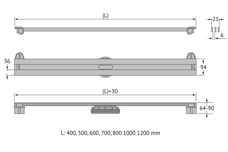 Решетка и декоративные заглушки, нержавеющая сталь AISI 304Комплект регулировки решетки по высоте от 8 до 25 ммСетка для волос, пластикКомплект гидроизоляцииЖелоб водосток, нержавеющая сталь AISI 304Монтажная заглушка, пенопластРегулируемые по высоте ножки, пластикСамопромывной S-образный сифон PP:Вертикальный выпуск пропускная способность 48л/мин, монтаж 360°Монтажный ключ, пластик