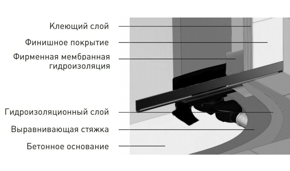 Решетка и рамка, нержавеющая сталь AISI 304Комплект регулировки рамки и монтажные углыСетка для волос, нержавеющая сталь AISI 304Комплект гидроизоляцииЖелоб водосток пристенный, PP Регулируемые по высоте ножки, пластикСамопромывной S-образный сифон с переходником PPВертикальный выпуск S-сифон D50/105мм H30/135мм, пропускная способность 42л/мин, монтаж 360°Монтажный ключ, пластик