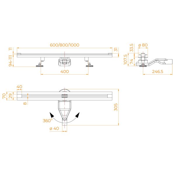 Принимающей декоративный жёлоб маскирует сливное устройство, образует щель, куда сливается вся вода из душевого пространства. Для того чтобы вода эффективно отводилась в трап, на этапе монтажа необходимо обеспечить уклон облицовочной плитки в сторону принимающего жёлоба.Для доступа к технической части устройства с целью очистки необходимо извлечь среднюю часть жёлоба вместе с боковыми декоративными заглушками.Лоток выполнен из нержавеющей стали толщиной 2 мм, собирает стекающую воду и за счёт технического уклона отводит её в сетку-фильтр, которая задерживает волосы и мелкий мусор.Далее вода проходит в сифон с комбинированным затвором, Первая вода сталкивается с сухим затвором, который изготовлен из высокопрочного ABS-пластика. Затвор выполнен в виде крышки с силиконовой прокладкой, крышка открывается под давлением воды и плотно притягивается при отсутствии воды за счёт пружинного механизма, обеспечивая 100% защиту от проникновения неприятных запахов в ванную комнату из канализации.После вода проходит через сифон с гидрозатвором и сливается в канализацию.Сифон с гидрозатвором присоединяется к нижней части лотка трапа и имеет боковой отвод с поворотом на 360 градусов, что позволяет подключить канализационный сток с любой стороны.