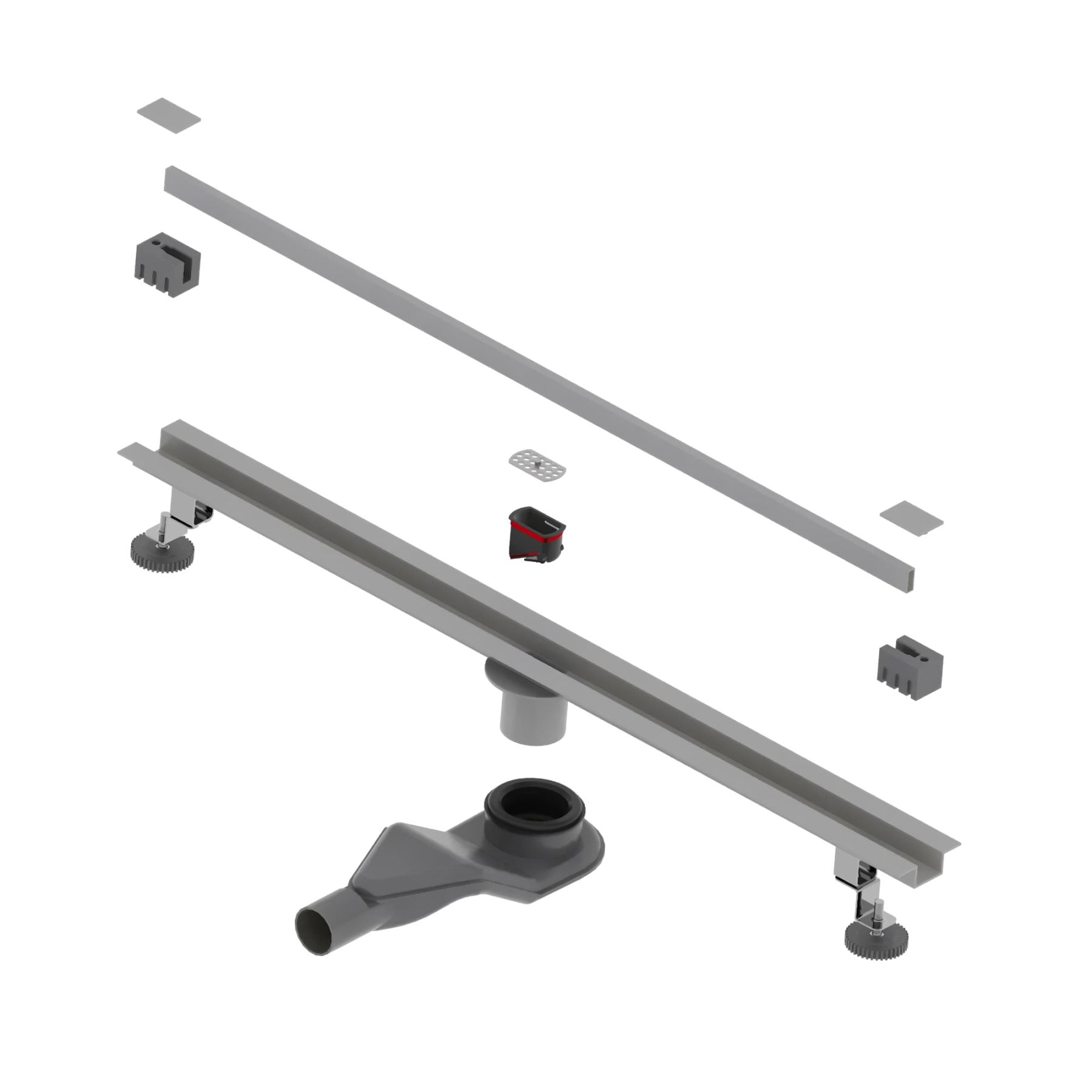 Принимающей декоративный жёлоб маскирует сливное устройство, образует щель, куда сливается вся вода из душевого пространства. Для того чтобы вода эффективно отводилась в трап, на этапе монтажа необходимо обеспечить уклон облицовочной плитки в сторону принимающего жёлоба.Для доступа к технической части устройства с целью очистки необходимо извлечь среднюю часть жёлоба вместе с боковыми декоративными заглушками.Лоток выполнен из нержавеющей стали толщиной 2 мм, собирает стекающую воду и за счёт технического уклона отводит её в сетку-фильтр, которая задерживает волосы и мелкий мусор.Далее вода проходит в сифон с комбинированным затвором, Первая вода сталкивается с сухим затвором, который изготовлен из высокопрочного ABS-пластика. Затвор выполнен в виде крышки с силиконовой прокладкой, крышка открывается под давлением воды и плотно притягивается при отсутствии воды за счёт пружинного механизма, обеспечивая 100% защиту от проникновения неприятных запахов в ванную комнату из канализации.После вода проходит через сифон с гидрозатвором и сливается в канализацию.Сифон с гидрозатвором присоединяется к нижней части лотка трапа и имеет боковой отвод с поворотом на 360 градусов, что позволяет подключить канализационный сток с любой стороны.