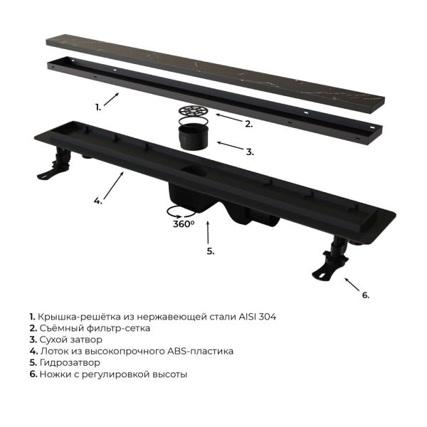 Душевой трап Leo-31 – это сантехническое изделие, созданное для отведения воды из зоны, душевого пространства, выложенное керамической плиткой или мозаикой. Трап укомплектован комбинированным затвором гидро+сухой затвор, такая конструкция позволяет на 100% исключить проникновение неприятного запаха в ванную комнату. Решётка выполнена из нержавеющей стали AISI 304, а лоток выполнен из высокопрочного ABS-пластика, такая конструкция обеспечивает максимальную надёжность конструкции более 10 лет. Для эффективного стока воды лоток трапа имеет технический уклон, а для улавливания крупного мусора и волос в конструкцию входит съёмный фильтр-сетка, с помощью которого трап с лёгкостью очищается. В комплектации присутствуют ножки с регулировкой высоты, что позволит с лёгкостью произвести монтаж трапа в пол. Нижний сифон имеет поворотное основание, что позволит подвести сливную трубу с любой стороны. Пропускная способность 42 л/мин.
