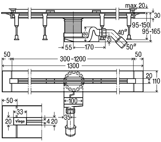 Душевой лоток Viega Advantix Vario Set 704360 укорачиваемый 300-1200 мм хром глянцевый в наличиипропускная способность 0,4-0,8 л/с;Регулируемая высота 95–165 ммКомплектация: