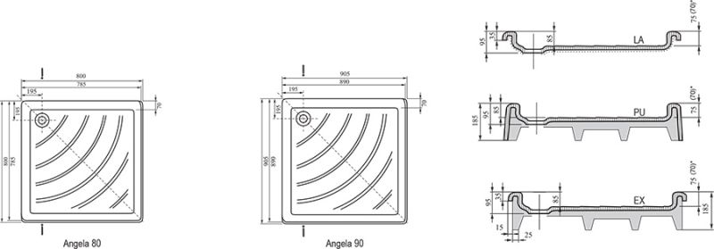 Поддон Angela подходит для душевых уголков SRV2-S+SRV2-S, ASRV3+ASRV3, BLRV2, SMSRV4, BSRV4, BSDPS и ванных комнат с душевыми дверьми ASDP3, SDZ3, SDOP, PDOP1, SMSD2, BSD2 .