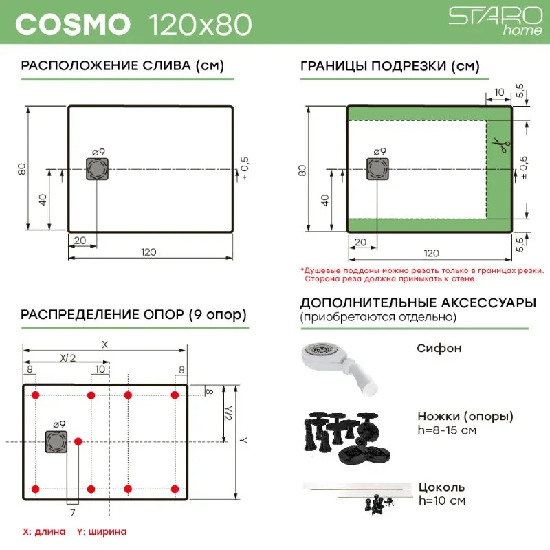 Душевые поддоны COSMO производятся на современном европейском оборудовании для европейского рынка. Контроль качества осуществляется на всех этапах производства. Нескользящая поверхность Antislip. Поверхность с имитацией сланца. Прочный (выдерживает вес свыше 300 кг). Высокая износостойкость. Стойкий к перепадам температур. Стойкий к воздействию химических веществ. Устойчивый к загрязнениям. Не меняет цвет от времени. Экологически нейтральный материал. Теплый на ощупь, приятный тактильный эффект. Хорошее шумопоглощение (в отличие от стали и акрила). Легко моется с использованием бытовых моющих средств. Возможность подрезки под индивидуальный размер. Гарантия 3 года.