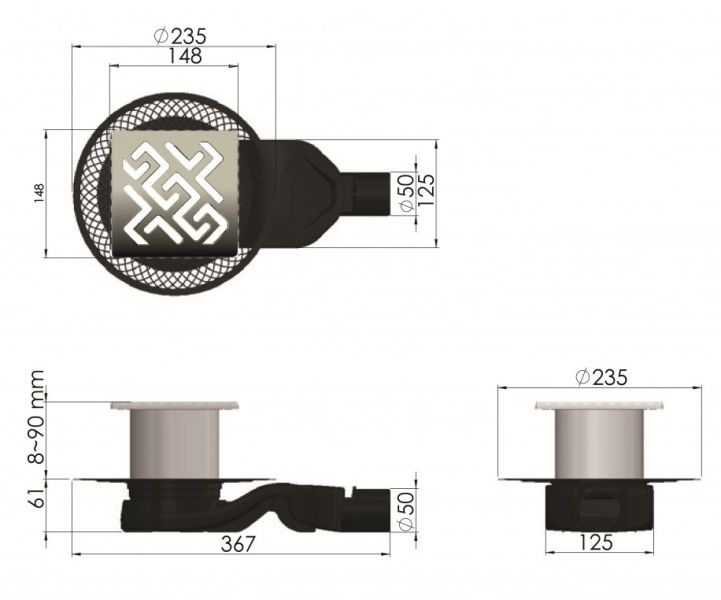 Решетка толщина 3мм, нержавеющая сталь AISI 304Горловина трапа, пластикФланец трапа с переходником, РРМонтажная заглушка, PPСамопромывной S-образный сифон PPГоризонтальный выпуск D50 H60, пропускная способность 42л/мин, монтаж 360°Монтажный ключ, пластик