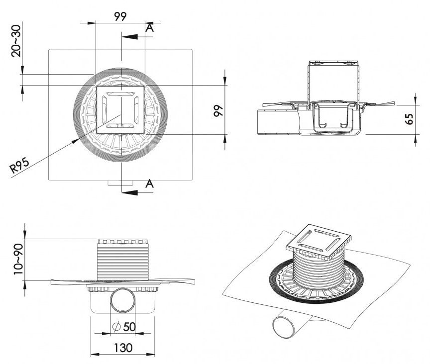 Решетка толщина 3мм, нержавеющая сталь AISI 304Горловина трапа и эксцентрик, пластикМонтажная заглушка, PPСифон PP с гидроизоляциейГоризонтальный выпуск D50 H65, монтаж 360°Комбинированный затворФланец с 3 сторон загибается на 90°Монтажный ключ, пластик