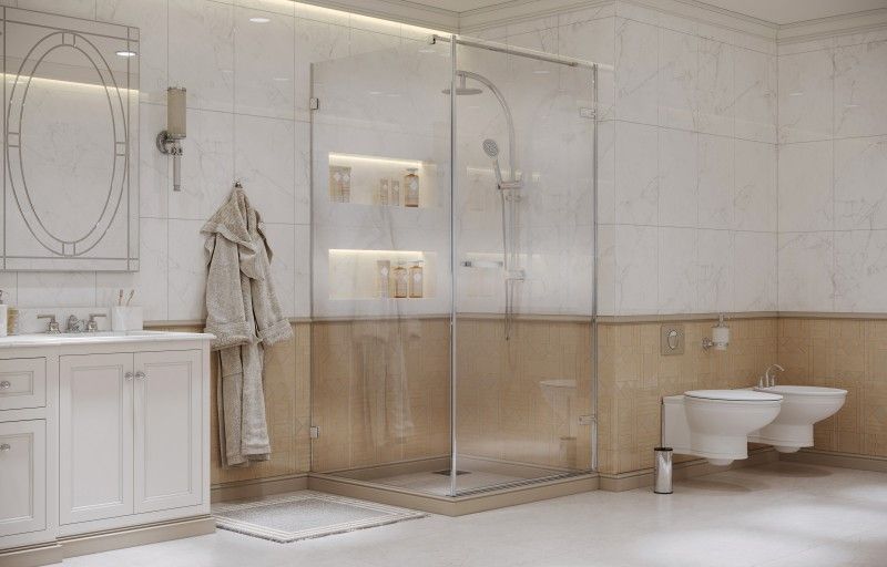 «Утопленные» в стекло петли с внутренней стороны ограждения значительно облегчают уход за душевым уголком.
