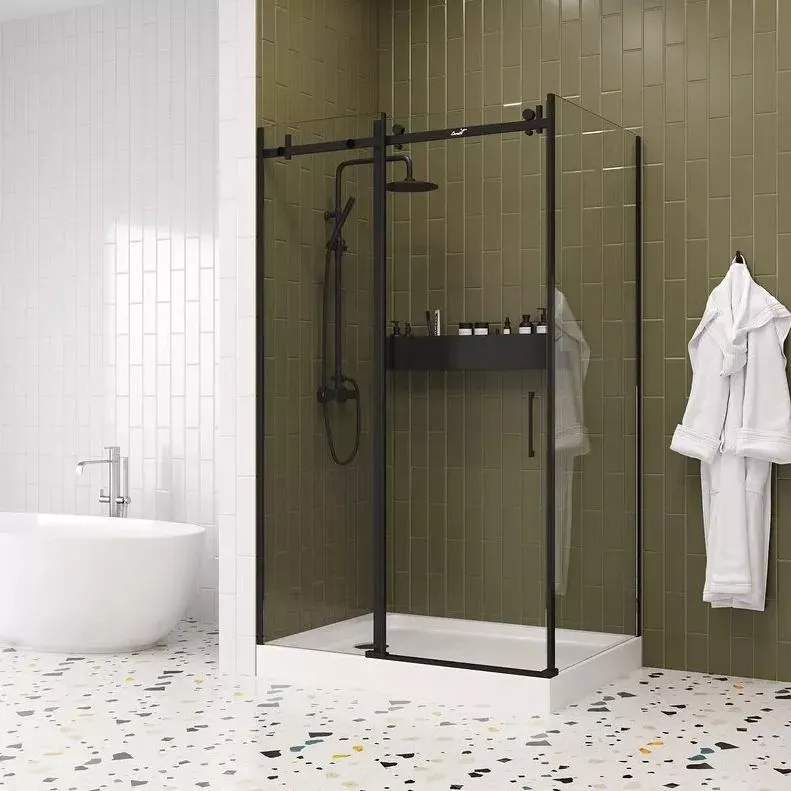 Раздвижная дверь с магнитным замком Soft close. В открытом состоянии створка не занимает полезную площадь в ванной. А магнитный замок обеспечивает плотное закрытие двери и предупреждает попадание воды на пол.