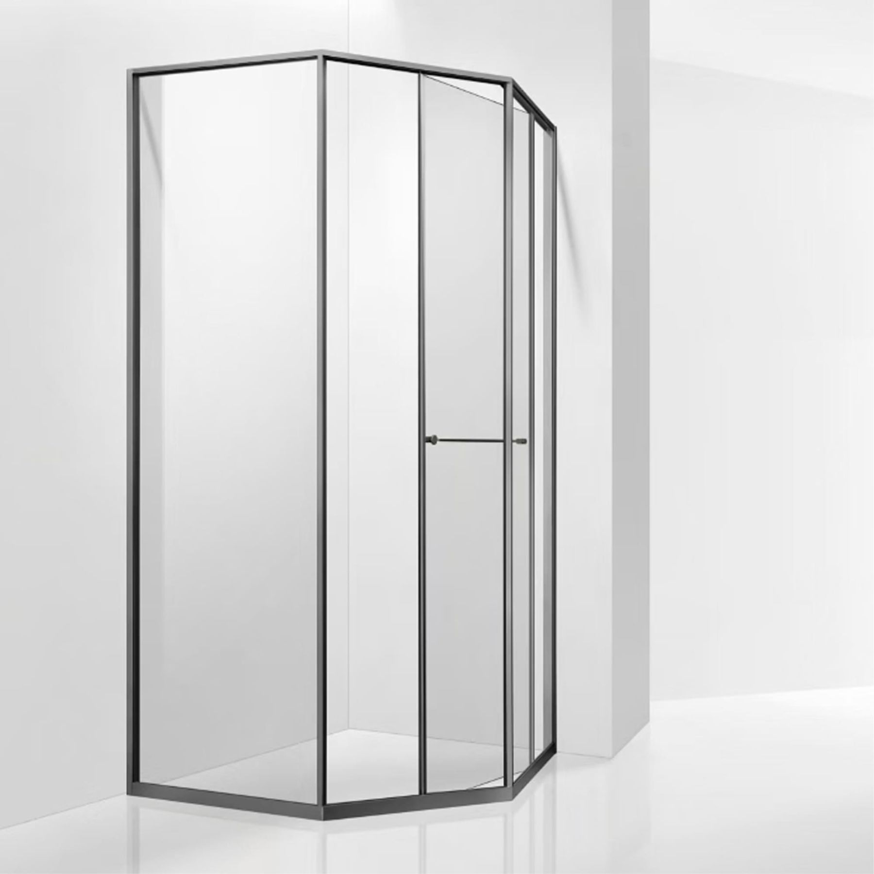 Инновационный механизм раздвижной системы при открытии плавно смещает дверь вдоль стационарного стекла при этом обеспечивая комфортный вход и просторное пространство внутри душевого угла.