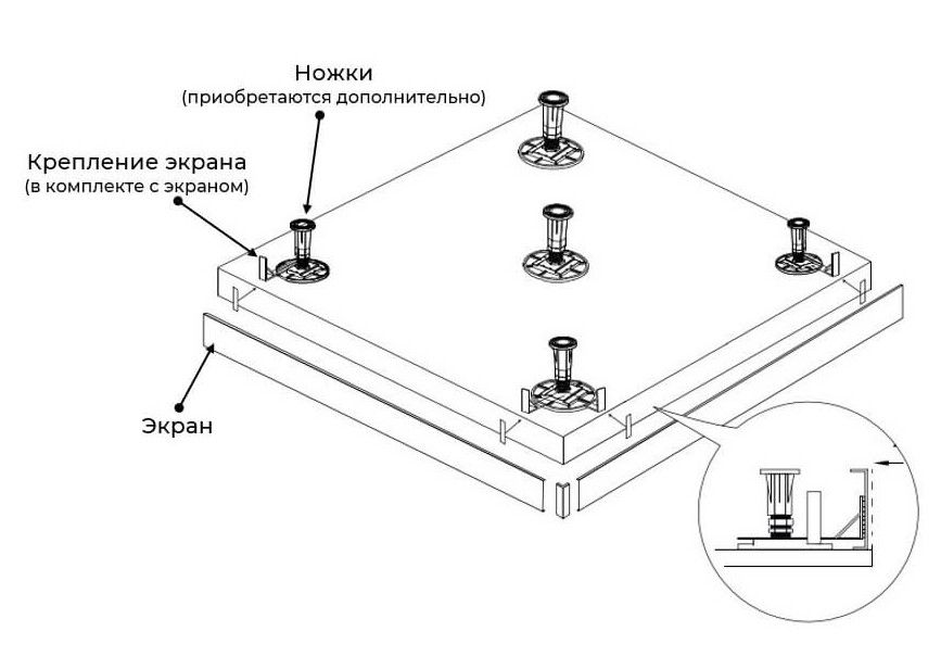 Рекомендованы ножки для поддона для установки экрана:
