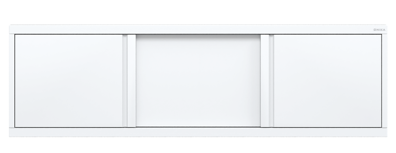 По всему периметру экрана расположена усиленная рама, выполненная из алюминия. Конструкция имеет три подвижные раздвижные двери из МДФ, покрытых высокоглянцевой белой пленкой. На боковых дверцах расположены интегрированные ручки.