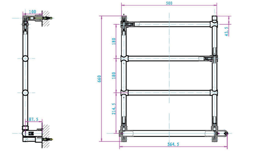 Фиксированный электрический полотенцесушитель, изготовлен из латунных труб диаметром 25 мм.