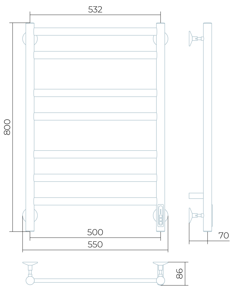Заглушки на концах стоек, тип диммера - кнопочный (Quick Touch), крепления к стене.