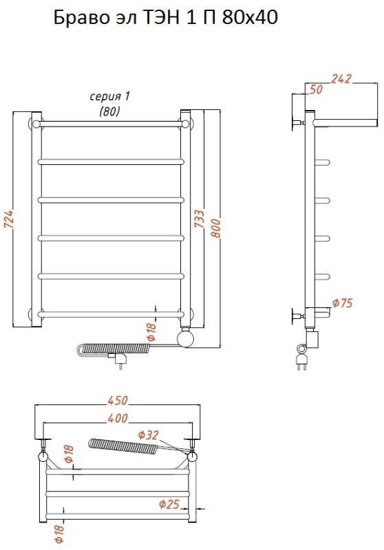 Внимание! Для скрытого монтажа электропроводки необходимо приобрести комплект скрытого подключения.Полотенцесушитель электрический комплектуется ТЭНом с терморегулятором и таймером.Изделие производится из нержавеющей стали AISI 201. Вертикальные трубы d -32 мм., для горизонтальных вставок используется труба d — 18 мм.Нагревательным элементом в полотенцесушителе является ТЭН. Полотенцесушитель заполнен бытовым антифризомЭкономичность: ТЭН нагревает антифриз до нужной температуры и выключается, далее при остывании полотенцесушителя он включается опять. Таким образом он работает не постоянно и получается, что ТЭН потребляет электричество не 300 Вт, а порядка 100 — 150 ВтМощность электрического прибора порядка 100 Вт при стоимости 1 Вт — 5 руб несложно посчитать: 100Вт х 24 = 2,4 кВт в сутки. Стоимость эксплуатации изделия за сутки 2,4 кВт х 5 руб. = 12 руб. При максимальной температуре расход электричества за 30 дней составит порядка 360 руб. При условии если сушка работает круглосуточно на максимальной температуре.Удобство монтажа: Полотенцесушитель крепится к стене на четыре держателя. Изначально ТЭН не установлен в полотенцесушитель для безопасной транспортировки, его можно установить, как справа, так и слева предварительно перевернув полотенцесушитель вверх ногами и выкрутив заглушку с нужной стороны на место в которое установится ТЭН.Примечание. Внимательно изучите инструкцию по установке ТЭНа!Скрытое подключение: Для скрытого монтажа электропроводки необходимо приобрести комплект скрытого подключения.Подключение в розетку: В комплекте с ТЭНом имеется шнур с вилкой, который будет необходим при подключении к розетке.