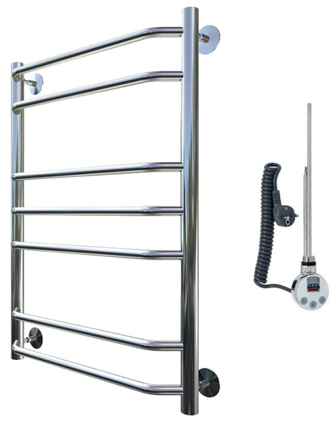 Внимание! Для скрытого монтажа электропроводки необходимо приобрести комплект скрытого подключения. Полотенцесушитель электрический комплектуется ТЭНом с терморегулятором и таймером. Изделие производится из нержавеющей стали AISI 201. Вертикальные трубы d -32 мм., для горизонтальных вставок используется труба d — 18 мм. Нагревательным элементом в полотенцесушителе является ТЭН. Полотенцесушитель заполнен бытовым антифризом.Экономичность: ТЭН нагревает антифриз до нужной температуры и выключается, далее при остывании полотенцесушителя он включается опять. Таким образом он работает не постоянно, и получается, что ТЭН потребляет электричество не 300 Вт, а порядка 100 — 150 Вт.Мощность электрического прибора порядка 100 Вт при стоимости 1 Вт — 5 руб несложно посчитать: 100Вт х 24 = 2,4 кВт в сутки. Стоимость эксплуатации изделия за сутки 2,4 кВт х 5 руб. = 12 руб. При максимальной температуре расход электричества за 30 дней составит порядка 360 руб. При условии если сушка работает круглосуточно на максимальной температуре.Удобство монтажа: Полотенцесушитель крепится к стене на четыре держателя. Изначально ТЭН не установлен в полотенцесушитель для безопасной транспортировки, его можно установить, как справа, так и слева предварительно перевернув полотенцесушитель вверх ногами и выкрутив заглушку с нужной стороны на место в которое установится ТЭН.Примечание. Внимательно изучите инструкцию по установке ТЭНа!Скрытое подключение: Для скрытого монтажа электропроводки необходимо приобрести комплект скрытого подключения.Подключение в розетку: В комплекте с ТЭНом имеется шнур с вилкой, который будет необходим при подключении к розетке.
