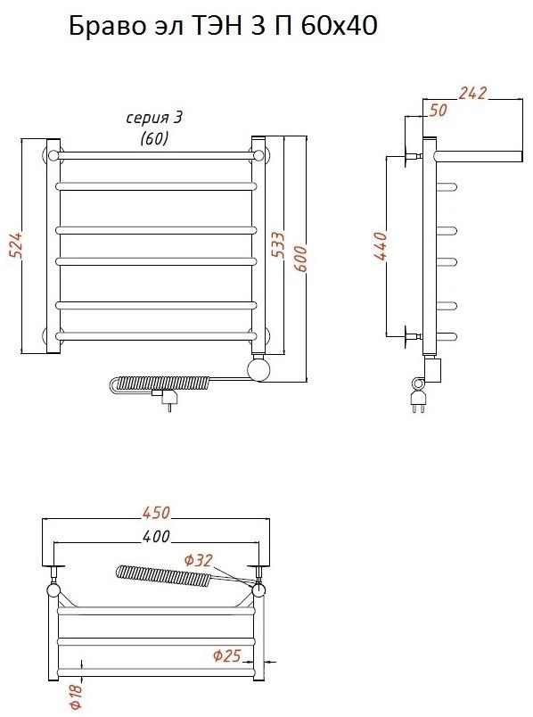 Внимание! Для скрытого монтажа электропроводки необходимо приобрести комплект скрытого подключения. Полотенцесушитель электрический комплектуется ТЭНом с терморегулятором и таймером. Изделие производится из нержавеющей стали AISI 201. Вертикальные трубы d -32 мм., для горизонтальных вставок используется труба d — 18 мм. Нагревательным элементом в полотенцесушителе является ТЭН. Полотенцесушитель заполнен бытовым антифризом.Экономичность: ТЭН нагревает антифриз до нужной температуры и выключается, далее при остывании полотенцесушителя он включается опять. Таким образом он работает не постоянно, и получается, что ТЭН потребляет электричество не 300 Вт, а порядка 100 — 150 Вт.Мощность электрического прибора порядка 100 Вт при стоимости 1 Вт — 5 руб несложно посчитать: 100Вт х 24 = 2,4 кВт в сутки. Стоимость эксплуатации изделия за сутки 2,4 кВт х 5 руб. = 12 руб. При максимальной температуре расход электричества за 30 дней составит порядка 360 руб. При условии если сушка работает круглосуточно на максимальной температуре.Удобство монтажа: Полотенцесушитель крепится к стене на четыре держателя. Изначально ТЭН не установлен в полотенцесушитель для безопасной транспортировки, его можно установить, как справа, так и слева предварительно перевернув полотенцесушитель вверх ногами и выкрутив заглушку с нужной стороны на место в которое установится ТЭН.Примечание. Внимательно изучите инструкцию по установке ТЭНа!Скрытое подключение: Для скрытого монтажа электропроводки необходимо приобрести комплект скрытого подключения.Подключение в розетку: В комплекте с ТЭНом имеется шнур с вилкой, который будет необходим при подключении к розетке.