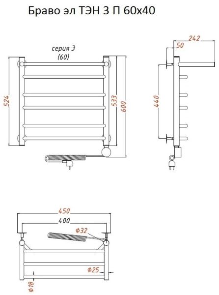 Электрический полотенцесушитель Тругор Браво 3 П с полкой 60x40см хром Браво3/элТЭН6040П