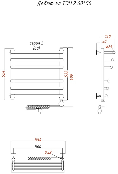 Электрический полотенцесушитель Тругор Дебют 2 60x50см хром Дебют2/элТЭН6050