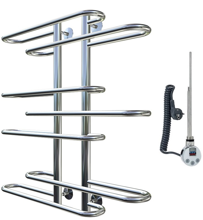 Внимание! Для скрытого монтажа электропроводки необходимо приобрести комплект скрытого подключения.Полотенцесушитель электрический комплектуется ТЭНом с терморегулятором и таймером.Изделие производится из нержавеющей стали AISI 201. Вертикальные трубы d -32 мм., для горизонтальных вставок используется труба d — 18 мм.Нагревательным элементом в полотенцесушителе является ТЭН. Полотенцесушитель заполнен бытовым антифризомЭкономичность: ТЭН нагревает антифриз до нужной температуры и выключается, далее при остывании полотенцесушителя он включается опять. Таким образом он работает не постоянно и получается, что ТЭН потребляет электричество не 300 Вт, а порядка 100 — 150 ВтМощность электрического прибора порядка 100 Вт при стоимости 1 Вт — 5 руб несложно посчитать: 100Вт х 24 = 2,4 кВт в сутки. Стоимость эксплуатации изделия за сутки 2,4 кВт х 5 руб. = 12 руб. При максимальной температуре расход электричества за 30 дней составит порядка 360 руб. При условии если сушка работает круглосуточно на максимальной температуре.Удобство монтажа: Полотенцесушитель крепится к стене на четыре держателя. Изначально ТЭН не установлен в полотенцесушитель для безопасной транспортировки, его можно установить, как справа, так и слева предварительно перевернув полотенцесушитель вверх ногами и выкрутив заглушку с нужной стороны на место в которое установится ТЭН.Примечание. Внимательно изучите инструкцию по установке ТЭНа!Скрытое подключение: Для скрытого монтажа электропроводки необходимо приобрести комплект скрытого подключения.Подключение в розетку: В комплекте с ТЭНом имеется шнур с вилкой, который будет необходим при подключении к розетке.