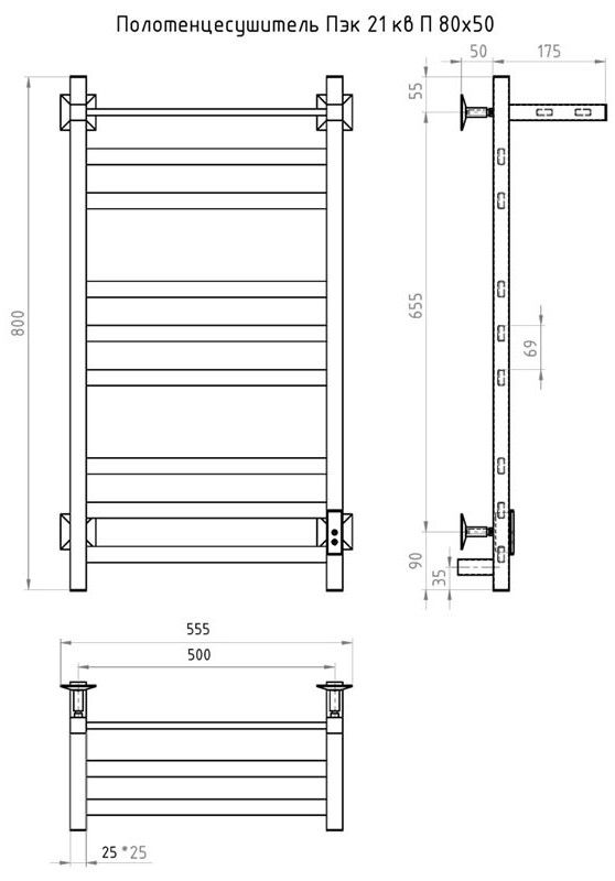 ПЭК — Полотенцесушитель электрический кабельный. Изделие производится из нержавеющей стали AISI 201. Вертикальные трубы d -32 мм., для горизонтальных вставок используется труба d — 18 мм.Нагревательным элементом в полотенцесушителе является греющий кабель — аналог «теплого пола», кабель заправляется внутрь каждой трубы и передает тепло на поверхность изделия. Во включенном состоянии постоянно поддерживается температура 50-600.Экономичность: Полотенцесушитель снабжен панелью управления. Кнопка включения/выключения и таймер на 2 часа и 4 часа, который позволяет включать изделие на ограниченное время. Эта функция дает возможность экономить электричество.Мощность электрического прибора порядка 60W при стоимости 1 кВт — 5 руб несложно посчитать: 60W х 24 = 1,5 кВт в сутки. Стоимость эксплуатации изделия за сутки 1,5 кВт х 5 руб. = 7,5 руб. Максимальный расход электричества за месяц примерно 225 руб. При условии если сушка работает круглосуточно.Удобство монтажа: Полотенцесушитель крепится к стене на четыре держателя. Универсальное исполнение изделия позволяет подключить его, как справа, так и слева.Скрытое подключение: Благодаря приваренным в нижней части вертикальных труб двум распаячным коробкам, в которых соединяется электропроводка, возможно скрытое подключение к электричеству слева и справа.Подключение в розетку: В комплекте также имеется шнур с вилкой, который будет необходим при подключении к розетке.Панель включения:РЕЖИМ №1 — постоянный нагревРЕЖИМ №2 — работа в течение 2 часов с последующим отключением.РЕЖИМ №3 — работа в течение 4 часов с последующим отключением.